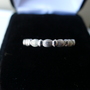 This gorgeous band has round moissanite stones that are very sparkly and go 1/2 way around. There is beautiful milgrain detail on either side of the stones. The band is a size 5, and the metal is sterling silver.