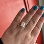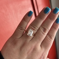 A gorgeous lab created emerald cut diamond ring set in 14k rose gold. The diamond specs are 4.69 carat E VS1 and dimensions are 11.13 x 7.82 x 5.11 mm. The diamond is IGI certified and laser inscribed matching the certification.