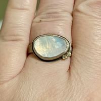 Reduced again! For sale is a practically new Ananda Khalsa rainbow moonstone and diamond ring. This handmade ring has an organic feel and is made of sterling silver. There are two little sparkly diamonds set in solid 22k yellow gold. The faceted rainbow moonstone has flashes of color in every lighting condition.