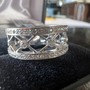 Very pretty eternity band that is weighty at 7.7 grams. It is about 8.5 mm wide and has pavé diamonds. Very elegant. It is about 6.5 on mandrel but I think better for a 6 to 6.5 finger size given the width.