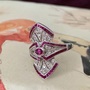 Center Ruby is bezel set and measures 4x5mm, which is roughly 0.50ct. There are twenty-six full cut diamonds of approximately 0.12cttw. This ring has caliber cut rubies accentuating all the curves found in Art Deco design. Stunner!