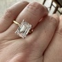 For sale is a beautiful lab grown emerald cut diamond set in a 14 kt yellow gold solitaire. The head that holds the diamond is white gold to emphasize the whiteness and glassiness of the diamond. This ring was just recently polished at my local jeweler. It’s sizable by any reputable jeweler near you. It’s currently sized to a 5.75.