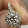 This diamond ring is crafted in 14kt white gold & contains a Round Diamond (1.42 carat weight, G color, vs1 clairity, for more information please see EGLUSA # 920058301D) surrounded by 140 round diamonds (1.04 total carat weight, G color VS clarity).