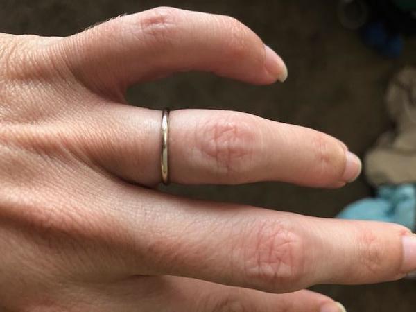 This cute stacking ring is 14k unplated white gold and is a size 5. It is a half round ring measuring 1.5mm in width and 0.8mm in height. It is in excellent condition. The last pic shows a comparasion of the unplated white gold to plated white gold.