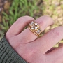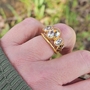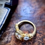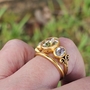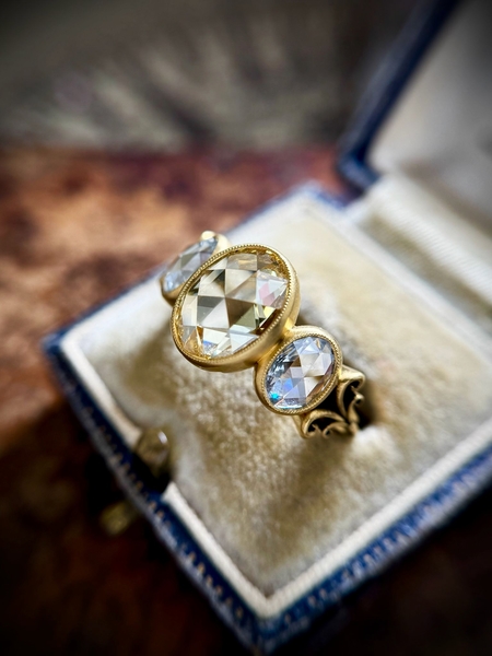 Beautiful 22K Yellow Gold 3 Stone by CVB_ID. This is such a gorgeous ring and so comfortable to wear. The antique style scrolls are perfectly executed. The custom cut Lab rose cut diamonds are perfectly shimmery and dance in all lighting conditions. The center diamond is graded as fancy yellow and is the perfect sunshine color. Lots of bold flashes of pastels reflected back.