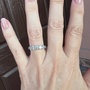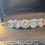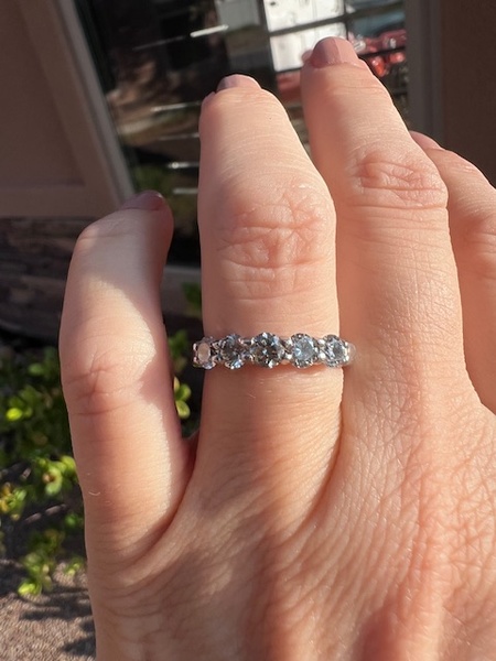 This is a classic five stone diamond ring from designer AJaffe. Each diamond measures 3.5-3.7mm so total is close to 1 ctw. They are in the colorless range. It is low profile and so very comfortable to wear, and has a great presence on the hand. It’s a 5.75-6 depending on the mandrel. It’s in platinum and a weighty 5 grams. Priced at $999 with $15 shipping.