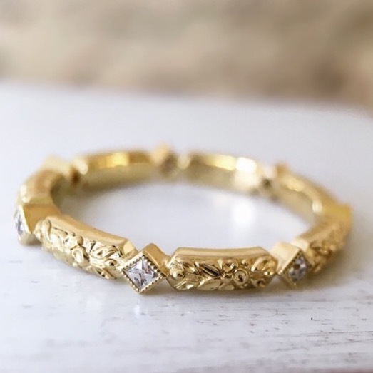 Drastically reduced, & your chance to own this band at below cost. Never worn & just competed GORGEOUS 18k CvB exclusive Sophia Band with seven (0.10ctw post cutting) glittering bezel set F-G/VS custom French Cut diamonds alternating with the hand carved floral stations. Size 5.5, which due to the style, is unable to be sized.