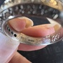 This is a gorgeous band that is really heavy. It's one of the things I really like about it. It's over 8 g of solid platinum. It is a size 6, and it is have a diamonds on all three sides which is really nice as well. There is an inscription on the inside with initials which I think makes things so much more romantic!