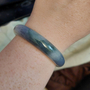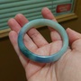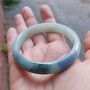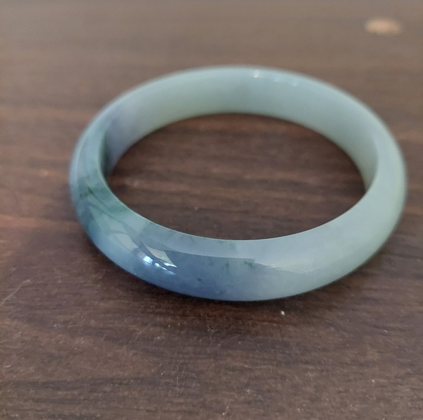 This is a natural typed A jadeite bangle. Some might called this a "Monet" bangle with its lovely deep purple and blue green hues on a light green base. It is translucent and has smooth texture on most of it. There is slight texture of the green flower part (see pictures). The lavender/blue purple color is hard to come by in deep color like this. The size is 59mm and about 12mm wide which rare to find in bigger sizes. This bangle has not cracks or lines in it.