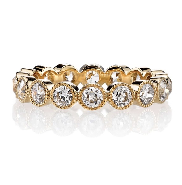 A beautifully handcrafted eternity band by Single Stone, featuring 1.68 carats total weight of antique old European cut diamonds. Each stone is individually bezel-set in rich 18K yellow gold, creating a timeless silhouette that feels both substantial and refined.
