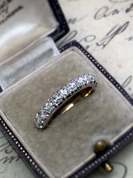 Full eternity band of antique style of 1.3ctw 2.8mm rose cut diamonds in a 3.5mm wide platinum & 18yg handmade cut down pavé Georgian inspired band.