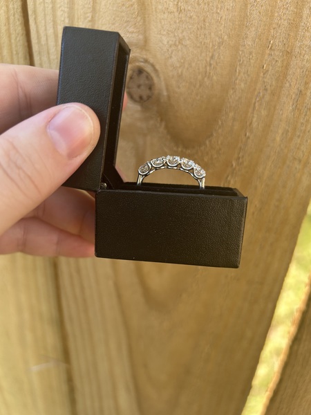 Putting out feelers for my DK platinum five stone. 40 pointer, all J color, eye clean and all GIA certified. Size 8 and has a good weight! In full disclosure, two of the stones were tightened by a jeweler on Galveston and set them low and the prongs don't match the others. Im sure it's something that David can fix, I just never got around to it. I tried to take pictures that will clearly show the prongs and how the diamonds are set. Otherwise, normal wear and ALOT of bling. Asking $3200 OBO.