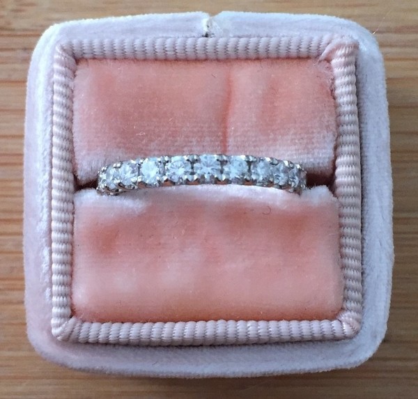 Offering for sale this diamond eternity band. I have had this ring for a year now and do not wear it enough to justify keeping it. The diamonds are set with u-prong pave so each diamond is secured by 4 tiny prongs. The metal is 19k so it does not require rhodium plating. The ring is somewhere between 2 and 2.5 mm wide.