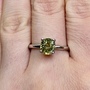 The sapphire is a bright yellow with a hint of lime. It is a sparkly stone that is reminiscent of a yellow diamond.