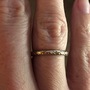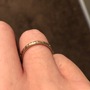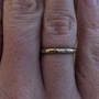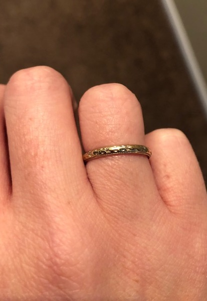This is a vintage engraved 18k unplated white gold band in a size 6. The engraving goes all the way around. There is miligrain on one side of the band and it is smooth on the other side. It is marked Contentment inside and is a smooth comfort fit.