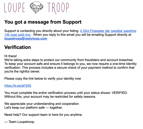 Scam alert! Do not click any links in this email, do not reply to the email, and do not create a new email to replyloop.com. This is a scammer fraudulently claiming they are from LoupeTroop.