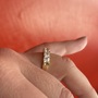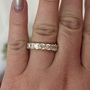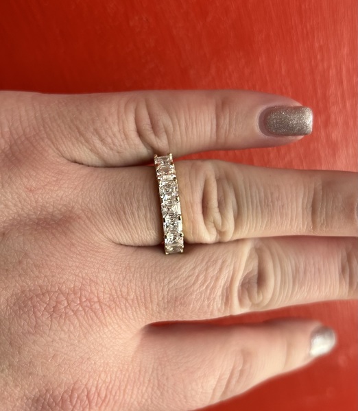 A gorgeous asscher cut moissanite half eternity band set in 10k yellow gold. The ring features 7 asscher cut moissanite measuring 4 mm and the band is 2 mm at it's thinnest. It is very comfortable and sits low on the finger.