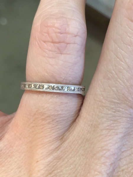 Here is a French cut diamond band made by David Klass. It is 14kt WG and the diamonds go about 2/3 around with engraving at the bottom and sides. It was only worn a handful of times. The French cuts are a mix of warmer I/J color and G color. It is 2.1mm wide and 1.8mm in height. DK can resize this band for you and keep the engraving in tact.