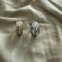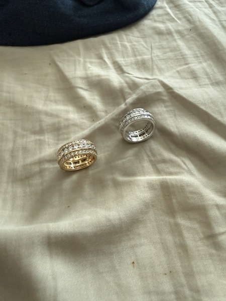 Analysis based on clear certification, detailed grading reports, and multiple high-quality photos. Estimated diamond count per ring ~60 for even spacing in three rows; individual stone size ~0.09 ct each. Metal gold solid based on style and weight, 16g.