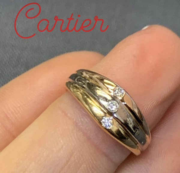 Featuring an authentic Cartier Tri-band with diamonds. Stamped 18K gold. Size 4.25. Shipping included if located in the US.