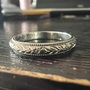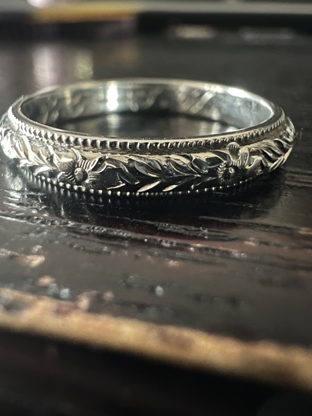 This is a lovely band that is about 3mm wide and 3 grams. It is BEAUTIFULLY carved with some of the most crisp details I have ever seen in a band. It looks like it has never been worn. It has initials inscribed, which I always find romantic. There is a hallmark that says GWL & Co 18k. When I research this Hallmark, I come up with GW Lewis & Co, who were British Silversmiths active in the 40s. This item is 18k white gold. It is a size 5.75 and is not sizable give the carved design.