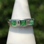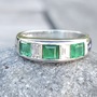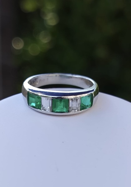 This is a pretty platinum half-eternity band. There are 3 square cut emeralds that total to about 0.83cts and 2 emerald-cut diamonds that total to about 0.45cts. There are multiple hallmarks including one for platinum.