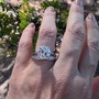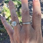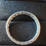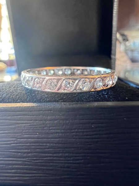 This is a lovely platinum eternity band that is around a size 8.25 – a coveted and difficult to find size in vintage bands. The cuts are what I would call transitionals – not mrb but not oec. Some have teeny open culets. It has about 70 points of stones that are bright and white. It is about 2.9mm and weighs 2.7 grams. It is 8.25 on my mandrel.