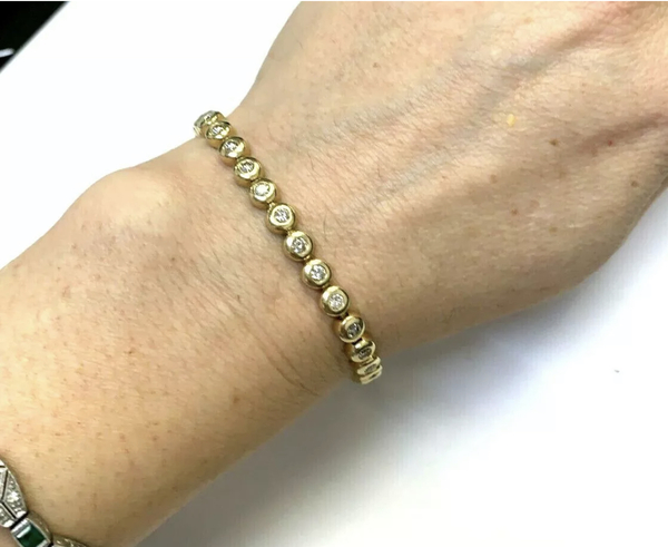 1.7 ctw diamond bezel tennis bracelet. Set in stamped 14K yellow gold. 7” in length. Featuring 34 brilliant cut diamonds, 0.05 carats each. Color is LKM, and clarity is SI3 without visible inclusions. Weight is 11.6 grams. Shipping is $20.