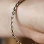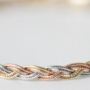 This is a very unique bracelet made in Italy! It has all three gold colors so it will match any of jewelries you wear each day. The workmanship is amazing and I have never seen anything like this anywhere else. It is delicately but also very tightly woven, creating the tension making it a bit oval-bangle style. It will fit any wrist between 14-17cm (5.5-6.75 in). You can basically take showers with it, sleep with it, and live with it!
