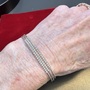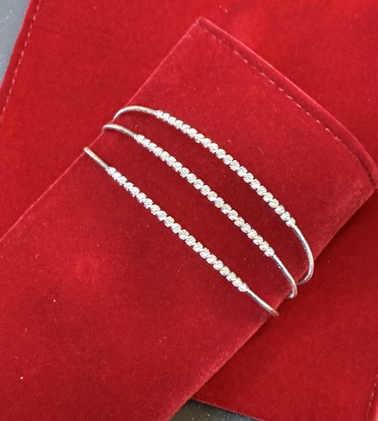 It’s an elegant 18K white gold Italian bracelet featuring three strands of 2mm diamond cut beads that have exceptional sparkle and texture. The bracelet is crafted with an internal flexible wire allowing it to easily slip on and comfortably adjust to the wrist.