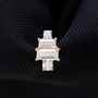 - Designer layout with baguette + round moissanite—distinctive styling rather than generic stud.