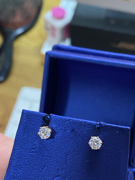14 karat rose gold six prong crown stud earrings with forever one moissanite. A half carat total weight with pushbackâs. Only a couple months old, unfortunately my second ear holes do not like them. Price includes shipping to the United States via priority. zoey.sophia.sohns@gmail.com Thank you!