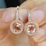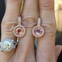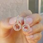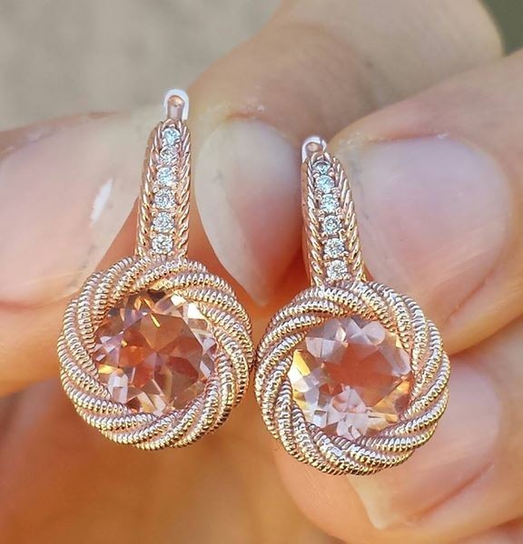 These earrings are incredible and have the most gorgeous fine detailing in the gold. Morganite stones are exactly the same color in real life, they just reflect a lot of light in pics and because of angles look different colors in some photos. The morganite stones are 7mm and look incredible in the rose gold. The morganite stones are a peachy color, not pink. They are such a unique and gorgeous color and will match any outfit. The diamonds are super white and bright. They are approximately F color and VS clarity and measure 1.5mm each. These diamonds are whiter than all of my G colored diamonds and soooo sparkly and gorgeous. Side and back views can be seen in video.