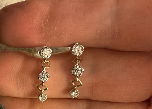Two tone 18k gold and diamond earrings. Diamond carat total weight is 50 points. Diamonds are G-I VS-Si quality. Beautiful. They drop ~0.75 inches. 6 stones total the largest is 3.25mm and the smallest is 2.3mm. Great for everyday. $650 OBO. I will ship to the US only. paypal F&F and Venmo accepted. Earrings came from https://robinsonsjewelers.com/products/18k-two-tone-drop-earrings-with-0-53-carats-of-round-diamonds-der-15280.