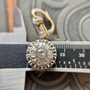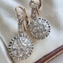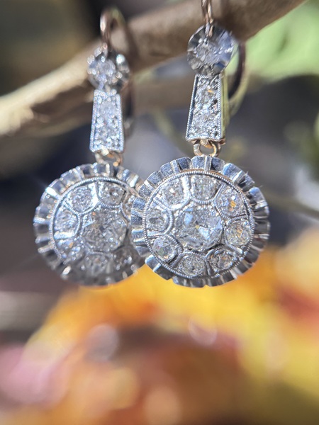 These impressive antique diamond earrings are crafted to make a statement. Set in 18k yellow gold with an 18k white gold front, they showcase Old Mine cut diamonds in a classic dormeuse drop style on a grand scale. The bottom drop features a striking halo design, with a larger diamond surrounded by smaller ones. Airy and intricate, the setting features details typical of antique craftsmanship from the beautiful basket setting to the hand applied milgrain, while the lever-back closures provide both comfort and security. The articulated design ensures that every movement catches the light, enhancing the earrings' brilliance. The 18k white gold ruffle around the halo adds a sense of grandeur, creating the appearance of a larger diamond from afar. These earrings are destined to become a favorite, comfortable enough for everyday wear yet striking enough for any red carpet-worthy occasion.