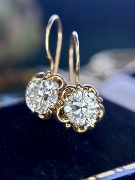 These bright and sparkling, antique, hand cut Old European Cut diamonds have just been pulled, graded and weighed loose for accuracy, before being remounted into these beautiful drop dormeuse earrings. Dormeuse Earrings are also known as sleeper earrings because they were said to be so light weight and comfortable they could be worn sleeping. This style is enduringly popular - suitable for everyday wear they will no doubt become your favorite pair of earrings.