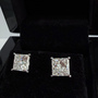 Large, 5 carats each, princess cut studs with a custom platinum mounting. Never worn. Both stones are certified G VVS2. Comes with certs and box