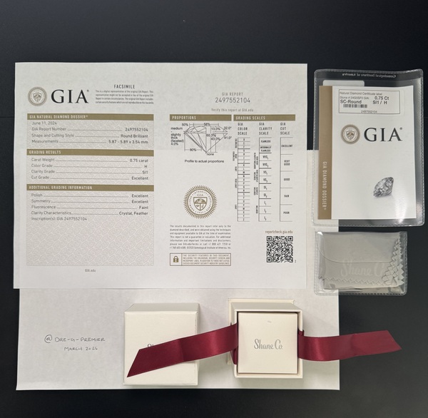As titled, we have a Shane Co. earring, it's a .75ct, Round Brillant, Sll, in a color grade H. It is less a year old and has been routinely polished and cleaned at Shane Co. under there lifetime warranty. Overnight shipping is available.