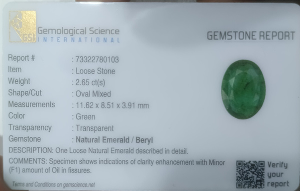 2.65ct GSI Certified Medium Green Zambian Emerald Minor Oiled Loose Gemstone.