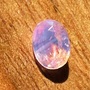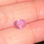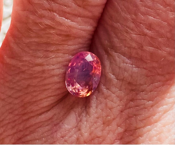 A fascinating and beautiful opalescent pink orange sapphire that shows off blue, purple, and silk when “activated” in sunlight. I’ve captured a few photos in different lighting conditions.