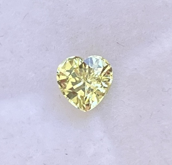 Chrysoberyl heart, 0.81ct. Purchased from Yvonne Raley. beautiful lemon yellow color with a teensy hint of lime, sparkles like a diamond. 5.5mm. Email: dreamer dot dachsie at gmail dot com