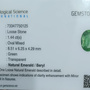 1.44 carats GSI certified medium shamrock green Zambian emerald. Minor oiled loose gemstone.