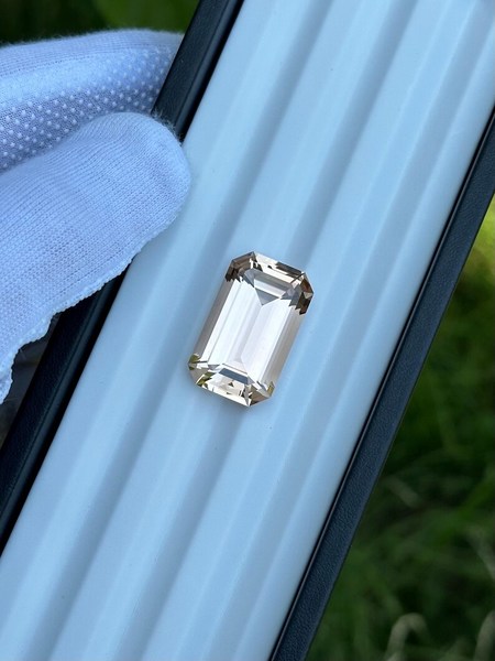 This impressive peach topaz from the Volyn deposit feature a sophisticated baguette octagon cut that emphasizes its soft, warm hue and remarkable transparency. With its substantial carat weight and elegant geometry, it is ideal for high-end custom jewelry or distinguished gemstone collection.