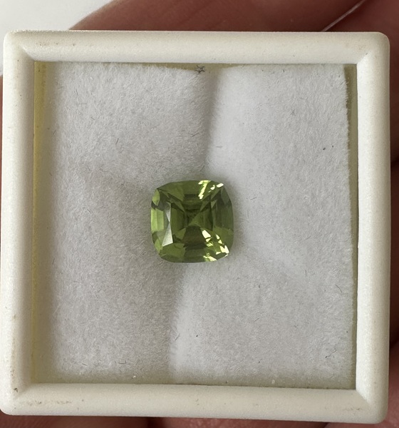 Beautiful and distinctive Burmese (Myanmar) period, custom work by Peter Torraca, a gemstone cutter known for precision faceting and exceptional light performance. This gemstone is cut in a new classic square cushion cut enhancing the stone’s color and clarity with outstanding symmetry and vibrant sparkle. The stone’s natural brilliance is showcased with lively flashes of green. This stone was purchased for my private collection with the intention of birthstone piece and reflects the amount of time invested in finding the right peridot that would make a timeless and high quality representation of such unique green. It has been stored carefully for 5 years in climate and light controlled conditions to ensure its excellent preservation.