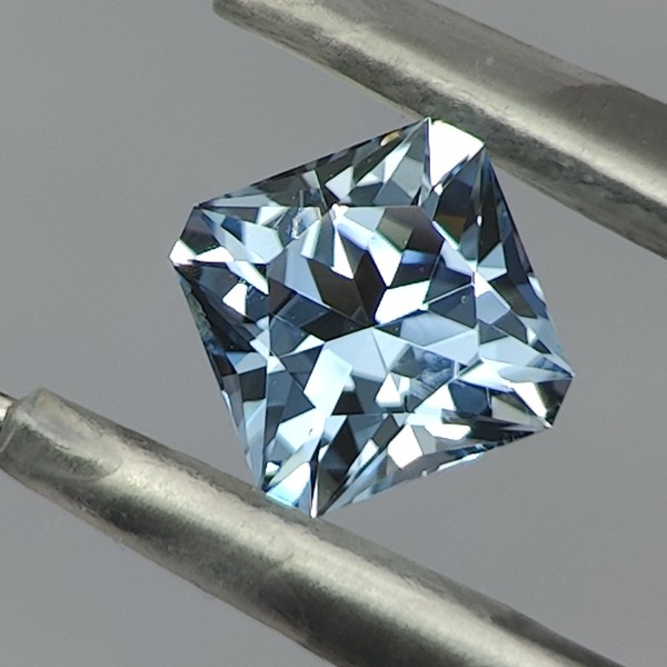 This beautiful Aquamarine is cut in a mixed design using a Radiant crown with a Princess style pavilion. It features 65 facets, a fully faceted and polished girdle.
