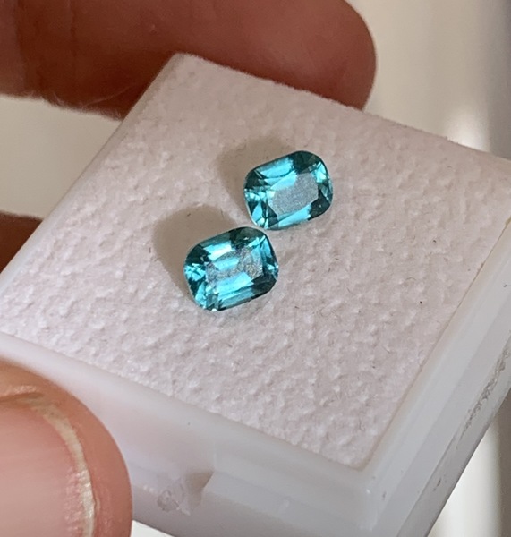 A striking and rare color pair of blue tourmaline, sometimes this color is called lagoon or peacock blue. Very richly saturated, almost like a neon teal color. Mostly blue, slightly green. Crisply cut in long cushions, would make excellent earrings or ring side stones.