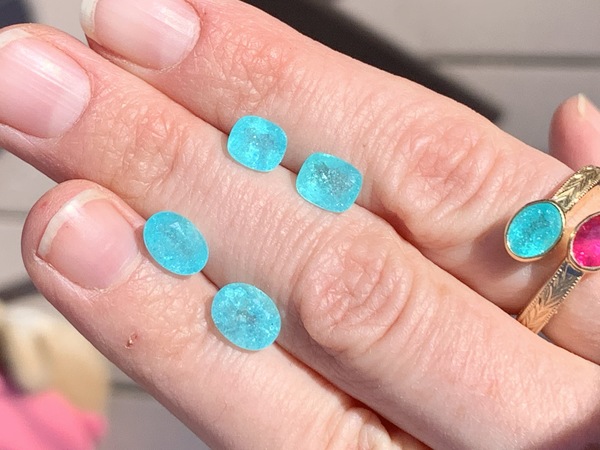 Two pair of quite clean rounds - extremely hard to find matched pairs. I had put these two pair together for a stunning drop earring design...but not sure when I'll be able to get to this so selling. These are reduced to $1800/ct. They are clean, bright and sparkly for Paraiba - quite stunning: