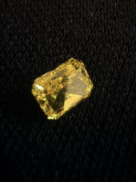 This is a cut cornered rectangular modified brilliant (radiant cut) with a vibrant Fancy Vivid Yellow color and excellent clarity. A great option for a unique engagement ring or custom jewelry piece.