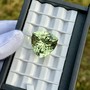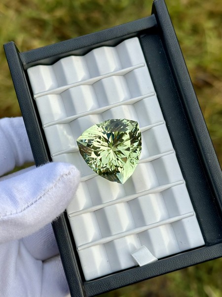 Natural green beryl from the Volyn deposit features a bold trilliant cut, impressive size, and eye-clean clarity