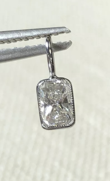 Newly made 0.40 radiant cut diamond pendant. The diamond is natural, E color, and VS clarity. The setting is made of 14K white gold with a lovely milgrain detail. The size of the pendant is 4mm x 11mm. Shipping included in the price if located in the US.